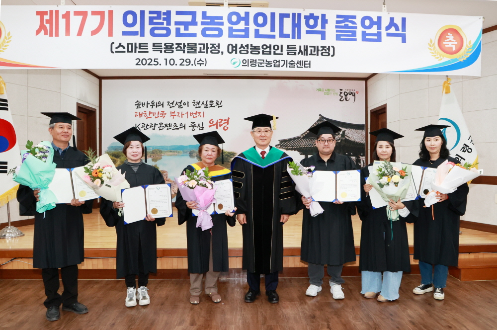 2개 과정에 총 52명 졸업생 배출 7개월간 100시간 학사 일정 마쳐 의령군은 지난달 29일 농업기술센터 3층 교육장에서 ‘제17기 의령군농업인대학 졸업식’을 개최했다고 1일 밝혔다. 이번 졸업식은 변화와 혁신을 선도할 전문 농업인력 양성을 목표로 추진된 교육과정의 결실을 맺는 자리였다. 올해로 제17회를 맞은 의령군농업인대학은 스마트 특용작물과정(24명), 여성농업인 틈새과정(28명) 등 2개 과정에서 총 52명의 졸업생을 배출했다. 지난 3월 25일 입학식을 시작으로 전공이론, 현장실습, 역량강화 교육 등을 포함해 약 7개월간 과정별 24회, 100시간의 학사 일정을 마쳤다. 이날 졸업식에서는 졸업생 전원에게 졸업증서가 수여됐으며, 김종갑 씨가 농촌진흥청장상을 받는 등 총 16명의 우수 졸업생이 수상의 영예를 안았다. 오태완 의령군농업인대학장은 “졸업생들이 배운 지식과 기술을 현장에 적극 활용해 의령농업의 지속가능한 발전을 이끌어주길 바란다”고 당부했다.