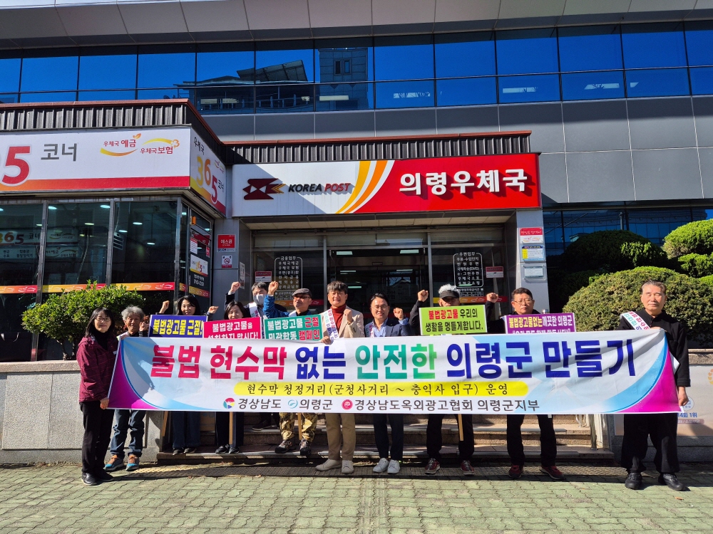 군청사거리에서 충익사 입구까지 청정거리로 지정 의령군은 의령전통시장 일원에서 ‘민관 합동 현수막 청정거리 홍보 캠페인’을 실시했다고 11일밝혔다. 이번 캠페인은 김성덕 경상남도 건축과장, 김해용 경남옥외광고협회장, 구정규 경남옥외광고협회 의령군지부장 등 민·관이 함께 참여해 추진됐다. 경상남도는 도시미관을 해치고 운전자의 시야를 가리는 불법 현수막을 근절하기 위해 ‘현수막 청정거리’를 지정·운영하고 있으며, 의령군은 군청사거리에서 충익사 입구까지 구간을 청정거리로 지정했다. 청정거리 내에서는 상업용과 공공용 현수막 게시가 금지되며, 교통 안내나 긴급사고 등 군민 안전과 관련된 현수막만 예외적으로 허용된다. 군은 이번 캠페인에서 개인사업자와 옥외광고업체를 대상으로 지정 게시대 이용을 안내하고, 청정거리 내 게시 금지 사항을 적극 홍보했다. 군 관계자는 “이번 캠페인을 통해 현수막 청정거리 운영을 다시 알리고 불법 현수막 근절에 대한 인식을 높였다”며 “군민 모두의 협조가 깨끗한 거리 조성의 힘이 된다”고 말했다.