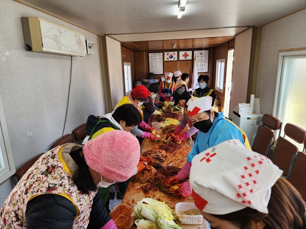 취약계층 등 160가구에 전달 대한적십자봉사회 의령지구협의회(회장 전호자)는 관내 어려운 이웃들의 따뜻한 겨울나기를 돕기 위해 회원 20명이 참여한 가운데 ‘사랑의 김장 나눔’ 봉사활동을 펼쳤다고 11일 밝혔다. 이날 회원들은 배추 300여 포기를 정성껏 손질해 김장김치를 담갔으며, 이를 취약계층 등 총 160가구에 전달했다. 사진...회원들이 김장김치를 담그는 모습