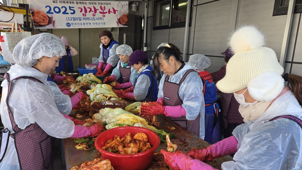 겨울철 도움이 필요한 이웃들에게 전달 한국자유총연맹 의령군지회(회장 하만우)는 의령어머니도시락에서 ‘효사랑 넘치는 의령군 만들기 사업’ 일환으로 김장 나눔 봉사활동을 실시했다고 12일 밝혔다. 회원 20여 명이 참여해 배추 150포기를 손질하고 김장을 담그는 작업을 함께했으며, 김장김치는 대의면 성로관과 지정면 사랑의 집 등 겨울철 도움이 필요한 이웃들에게 전달했다.