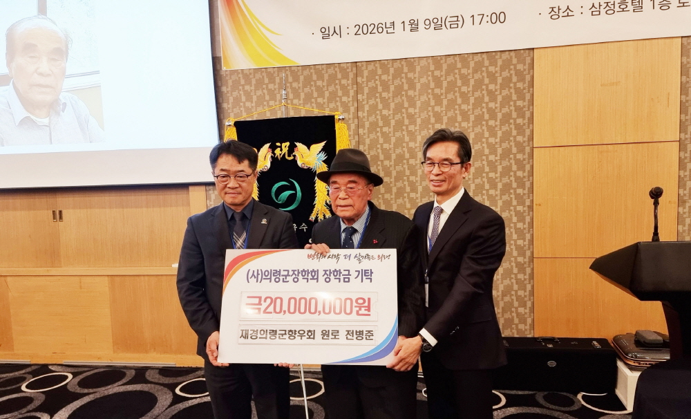 2026년 장학금 기탁 중 단일 최고 금액 의령군은 서울 강남구 삼정호텔에서 열린 ‘2026년 재경의령군향우회 신년하례회’에서 재경의령군향우회 원로 전병준 씨가 (사)의령군장학회에 장학금 2000만 원을 기탁했다고 15일 밝혔다. 전병준 씨는 의령군 칠곡면 출신으로, 재경의령군향우회 회원으로 활동하며 향우들 사이에서 두터운 신망을 받아왔다. 이번 장학금 기탁은 평소 지녀온 애향심과 후배 세대를 향한 관심을 실천으로 옮긴 사례로, 향우들에게 좋은 본보기가 되고 있다. 전병준 씨는 “고향 의령의 학생들이 좌절하지 않고 자신의 꿈을 향해 나아가길 바라는 마음으로 장학금을 기탁하게 됐다”며 “앞으로도 고향과 청소년들의 성장을 꾸준히 응원하겠다”고 말했다. 이번 장학금 기탁은 2026년 장학금 기탁 중 단일 최고액으로, 학생들이 보다 안정적인 환경에서 학업에 집중할 수 있는 든든한 지원이 될 것으로 기대된다. 사진...가운데가 전병준 씨
