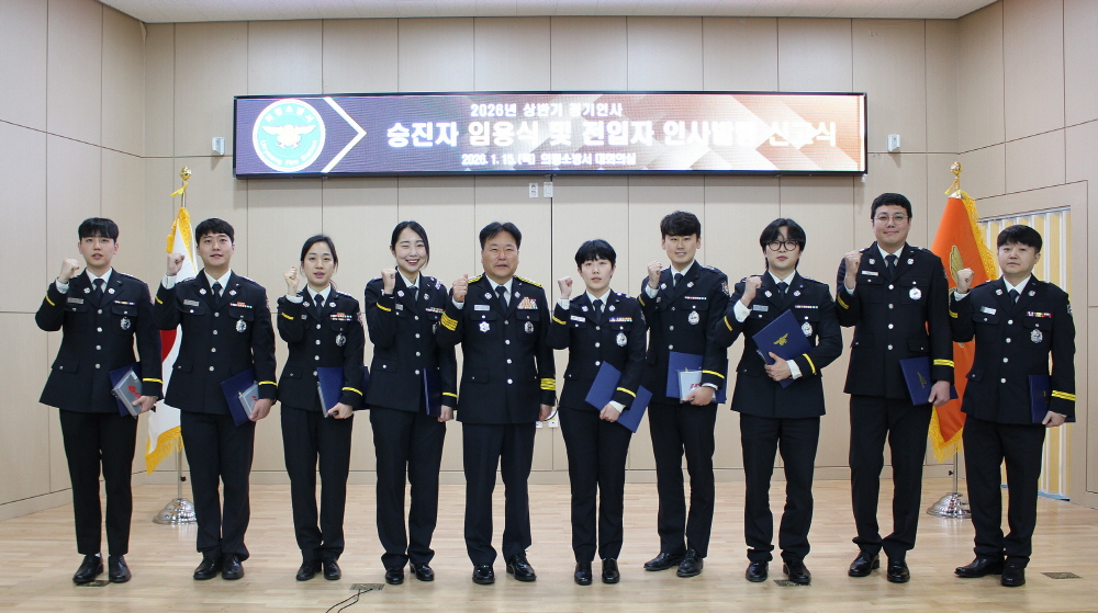 17명에게 임명장 수여 의령소방서(서장 강두훈)는 대회의실에서 승진 및 전입자 17명에 대한 신고식을 개최했다고 15일 밝혔다. 이날 신고식은 강두훈 서장을 비롯해 각 과장, 단장, 담당자 등이 참석한 가운데 임명장 수여, 환영 인사, 기념 촬영 순으로 진행했다. 각 신고자들은 적재적소에 배치돼 화재, 구조, 구급 등 현장 대응과 예방을 비롯한 행정업무를 담당한다. 강두훈 서장은 “승진과 전입을 진심으로 축하 드린다”며 “군민의 생명과 재산 보호를 최우선 가치로 삼고 맡은 자리에서 책임 있는 역할을 수행해 주길 바란다”고 말했다. 사진...신고식 후 사진 촬영한 모습