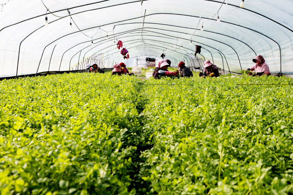 지하 100m 암반수 이용해 재배 의령군 자굴산(897m) 기슭에 자리한 가례면 밭미나리 비닐하우스에서 15일, 겨울 추위를 뚫고 땅에서 올라온 ‘자굴산 청정 밭미나리’ 수확이 한창이다. 자굴산 밭미나리는 생채로 먹는 친환경 작물로, 8월 중순 파종해 10월부터 연중 수확이 가능하다. 물미나리와 달리 한 해 5~10회 수확할 수 있어 지역 농가의 중요한 소득원이다. 1994년 자굴산 자락 가례면에서 전국 최초로 물 대신 땅에서 재배를 시작한 이후 꾸준히 지역 특산품으로 자리 잡았다. 맑고 깨끗한 지하 100m 암반수를 이용해 재배하며, 부드러운 잎과 줄기를 쌈으로 먹으면 특유의 향을 즐길 수 있다. 또한 물에서 재배하지 않아 거머리나 기생충 감염 걱정이 없어 생채로 섭취하기에 안전하다. 사진...청정 밭미나리 수확 모습