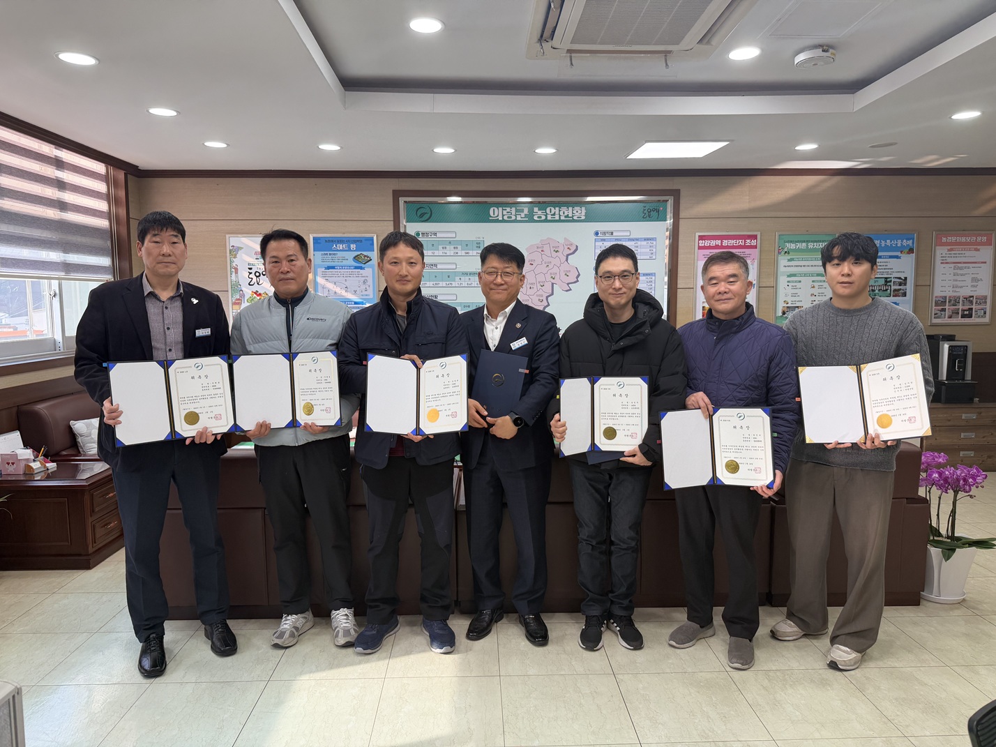 공수의, 가축방역관 등 9명 위촉 의령군은 2026년도 가축방역 사업의 원활한 추진을 위해 관내 개업 수의사 4명을 공수의로 위촉했다고 22일 밝혔다. 2026년 공수의로 위촉된 수의사들은 향후 1년간 구제역 등 가축전염병 예방접종을 비롯해 가축 진료, 브루셀라병, 결핵 혈청검사를 위한 채혈, 가축전염병 예찰 등 관내 가축방역 업무 전반을 지원하게 된다. 같은 날 위촉된 가축방역관 5명(공수의 및 공중방역수의사 포함)은 고병원성 조류인플루엔자(AI) 발생 시 역학조사와 예찰 및 검사, 이동통제, 농가 방역지도 등 현장 대응을 담당하며, 평상시에도 가축전염병 예방을 위한 지도·점검 업무를 수행한다. 의령군은 2025년 공수의 운영을 통해 한우, 젖소, 닭 등 135만9,080두에 대한 질병 예찰과 구제역, 럼피스킨 예방접종 5만1782두, 채혈 검사 1987두를 실시한 바 있다. 농업기술센터 관계자는 “공수의와 가축방역관을 중심으로 현장 예찰과 예방접종을 강화하고, 발생 시 신속 대응이 가능한 방역체계를 운영해 가축전염병 예방에 철저를 기하겠다”고 말했다. 사진...위촉장을 받은 후 사진 촬영한 모습