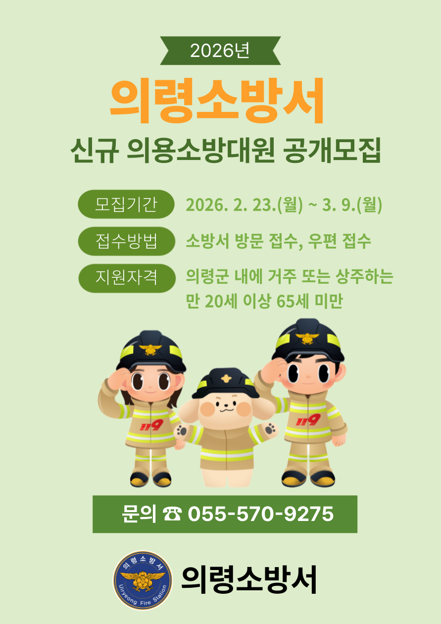 지역의 안전지킴이 역할에 참여 의령소방서(서장 강두훈)는 이달 23일부터 다음달 9일까지 지역사회 안전과 봉사활동에 관심이 있는 의령군민을 대상으로 신규 의용소방대원을 공개 모집한다고 20일 밝혔다. 의용소방대는 화재, 구조, 구급 등의 사고 발생 시 업무를 보조하고 각종 화재 예방 등 주민 생활의 안전을 위한 지원 활동에 참여하게 된다. 지원 자격은 의령군 내에 거주 또는 상주하는 만 20세 이상 65세 미만의 주민 중 ▲지역 내 안정된 사업장에서 근무하는 사람 ▲신체 건강, 강한 협동 정신을 가진 사람 ▲소방기술 관련 자격 또는 의사, 간호사, 응급구조사 자격 보유자 ▲기타 의용소방대 활동에 필요한 기술과 재능 보유 등에 해당하는 사람으로 남·여 모두 가능하다. 신청 접수는 의령소방서 홈페이지에 게재된 신청서를 작성하여 소방서 현장대응단 또는 각 119안전센터 및 119구조대 방문 접수 또는 우편 접수 가능하다. 자세한 사항은 의령소방서 홈페이지 및 의용소방대 업무 담당자(055-570-9275)로 연락하면 안내받을 수 있다. 심사는 1차 서류 심사를 통해 적격자 선정 후 2차 면접을 실시해 최종 합격자를 선정한다. 강두훈 소방서장은 “지역 재난 현장에 신속히 대응할 수 있고 각종 안전 봉사활동에 앞장서 지역의 안전지킴이 역할을 하는 의용소방대 지원에 젊고 유능한 의령 군민들의 많은 관심을 당부 드린다”고 말했다.