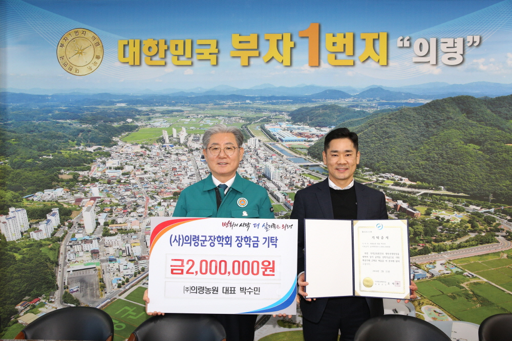 2015년부터 꾸준히 장학금 기탁 의령군은 의령농원(대표 박수민)에서 (사)의령군장학회에서 장학금 200만원을 기탁했다고 26일 밝혔다. 지정면에 위치한 의령농원은 가축관리와 환경보전 등 모든 면에서 선도적인 농장으로 평가받고 있다. 축사 내·외부를 체계적으로 관리해 쾌적한 사육 환경을 유지하고 있으며, 이러한 노력을 인정받아 2024년 경남에서 두 번째로 농림축산식품부의 ‘환경친화축산농장’으로 지정되기도 했다. 2015년부터 (사)의령군장학회에 꾸준히 장학금을 기탁하며 지역 인재 양성에도 힘써왔다. 박수민 대표는 “기업은 지역사회와 함께 성장해야 한다고 생각 한다”며 “앞으로도 지역의 미래를 이끌어갈 학생들에게 보탬이 될 수 있도록 나눔을 이어 가겠다”고 말했다. 사진...오태완 군수, 박수민 대표(오른쪽)