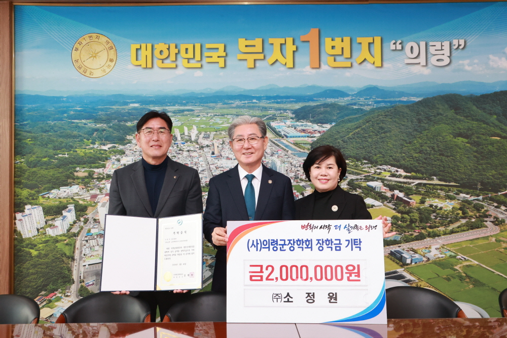 ㈜소정원은 의령군 의령읍에 위치한 조경건설업체로, 지역기반 기업으로서 지역사회와 상생하는 다양한 활동을 이어오고 있다. 이번 장학금 기탁 역시 지역 학생들이 안정적인 환경에서 학업에 전념할 수 있도록 돕기 위해 마련됐다.