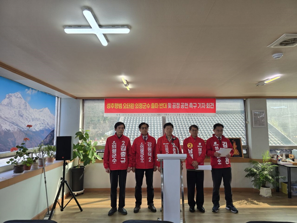 6·3 지방선거 의령군수 선거 출마 국민의힘(국힘) 공천 신청 후보자 5명이 3선에 도전하는 같은 당 오태완 의령군수의 공천 신청 철회와 군민 사과를 촉구하고 나섰다. 5명은 26일, 의령읍 한 후보자 사무실에서 기자회견을 열고 “오늘 이 자리는 2026년 지방선거에 의령군수 후보로 국힘에 공천을 신청한 강원덕, 김창환, 김충규, 남택욱, 손호현 후보자가 주최했다”며 기자회견 취지문과 성명서를 낭독했다. 이들은 “국힘 윤리위원회는 오 군수는 이미 기자간담회에서 여기자 강제추행 혐의로 유죄(벌금) 확정 판결을 받은 자 이므로 당규에 따라 탈당 권고 이상의 징계 절차를 신속히 진행하여 당원 자격을 박탈해야 할 것”이라며 “국힘 공천관리위원회는 경선 자격도 없는 자가 공천을 신청한 것이 명백하므로 신속히 컷오프 절차를 진행할 것을 촉구 한다”고 목소리를 높였다. 또 “만일 오 군수가 컷오프 되지 않고 경선에 참여한다면 우리 후보자 일동은 부당한 경선 참여로 간주하고 법적 조치 등 모든 수단을 동원해 강력 대응할 것”이라고 강조했다. 사진...국힘 공천 신청 후보자 5명 기자회견 모습