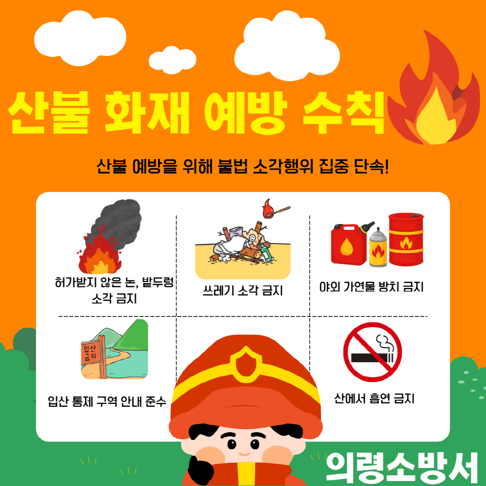 최근 5년간 화재 124건 중 85건이 야외 및 임야 집중 의령소방서(서장 강두훈)는 건조한 기후와 강풍으로 산불 위험이 급증하는 봄철을 맞아 산림 인접 지역의 논, 밭두렁 태우기, 쓰레기 불법 소각행위에 대해 집중 단속과 홍보를 실시한다고 17일 밝혔다. 소방서의 최근 5년(2021년~2025년) 통계에 따르면, 봄철 발생한 화재 124건 중 85건(68.5%)이 주거시설과 야외 및 임야에서 집중됐다. 특히 야외 및 임야 화재 비중은 56.6%로 주거시설(12.1%)보다 4.7배 빈번했다. 이에 소방서는 산림 인접 지역의 화재 예방을 위해 불법 소각행위를 집중 단속한다. 주요 단속 대상은 ▲허가받지 않은 논, 밭두렁 및 쓰레기 소각 행위 ▲화재 확산 위험이 있는 야외 가연물 방치 등이다. 산림 인접 지역에서의 소각행위는 ‘산림재난방지법’에 따라 엄격히 금지된다. 또한 ‘사전 신고’의 중요성을 홍보한다. ‘경상남도 화재예방 조례’에 따르면 화재로 오인할 만한 우려가 있는 불을 피우거나 연막소독을 할 경우 사전에 반드시 관할 소방서에 신고해야 한다. 만약 신고 없이 소각 행위를 해 소방차가 출동하게 되면 행위자에게 과태료가 부과될 수 있다. 강두훈 의령소방서장은 “봄철의 강한 바람은 작은 불씨를 순식간에 거대한 화마로 바꿀 수 있는 위험한 폭탄과 같다”며 “우리 모두의 소중한 자산인 산림을 보호하기 위해 논, 밭두렁 태우기 금지 등 기본적인 안전 수칙 준수에 군민 여러분들께서 자발적이고 적극적으로 동참해 주시길 부탁드린다”고 강조했다.