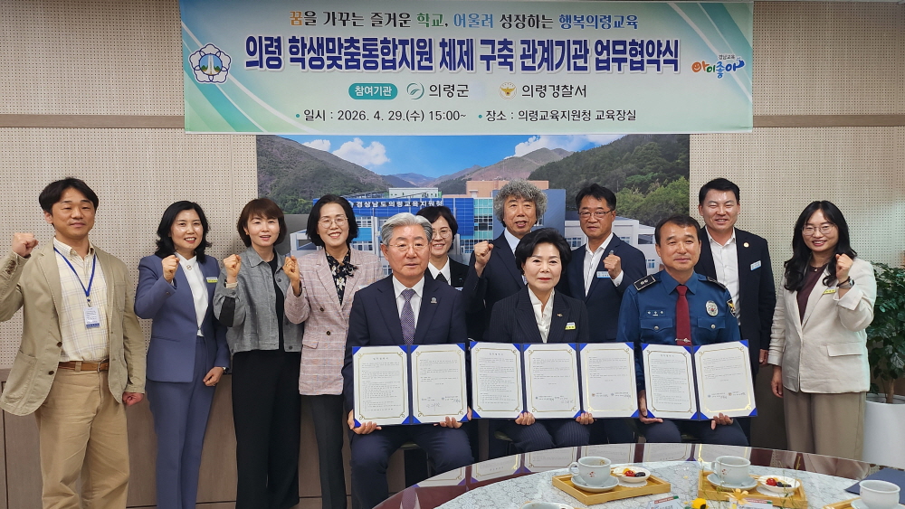 학생맞춤통합지원체계 구축 본격 가동 의령교육지원청(교육장 서회영)은 교육장실에서 의령군, 의령경찰서와 학생맞춤통합지원 업무협약을 체결했다고 29일 밝혔다. 오태완 의령군수, 경찰서 박상욱 경감이 참석한 이번 협약식은 학생 개개인의 다양한 필요와 상황에 맞춘 통합적 지원을 강화하고, 교육·복지·상담·보건 등 여러 분야 간 협력을 통해 학생의 전인적 성장을 돕기 위해 마련됐다. 특히 이번 협약은 지난 3월 31일, 11명의 전문 위원으로 구성된 '의령학생맞춤통합지원위원회'를 출범 시킨 데 이은 후속 조치로, 단위 학교 중심의 지원을 넘어 지역사회와 연계한 지속적이고 체계적인 지원이 가능할 것으로 기대된다. 주요 내용은 △위기 및 취약계층 학생 조기 발굴 △맞춤형 사례관리 및 서비스 연계 △정서·심리 지원 강화 △지역사회 자원 공유 및 협력 활성화 등이다. 3개 기관은 이를 통해 학생들이 학교 안팎에서 필요한 지원을 적시에 받을 수 있도록 긴밀한 협조 체계를 가동할 계획이다 서회영 교육장은 “이번 협약을 통해 학생 한 명 한 명의 상황을 세심하게 살피고, 필요한 지원을 통합적으로 제공할 수 있는 기반이 마련되었다.”며 “앞으로도 지역사회와 긴밀히 협력하여 모든 학생이 건강하게 성장할 수 있도록 최선을 다하겠다.”고 강조했다 사진...3개 기관의 업무협약 체결 후 사진 촬영한 모습