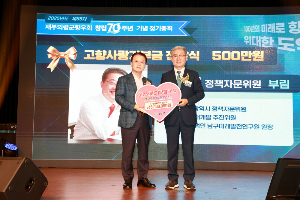 의령군은 재부의령군향우회 부회장으로 활동 중인 진남일(사진 왼쪽)전 부산시의원이 고향발전을 위해 지난 13일 열린 재부의령군향우회 창립 70주년 정기총회에서 고향사랑기부금 500만원을 기부했다고 18일 밝혔다.