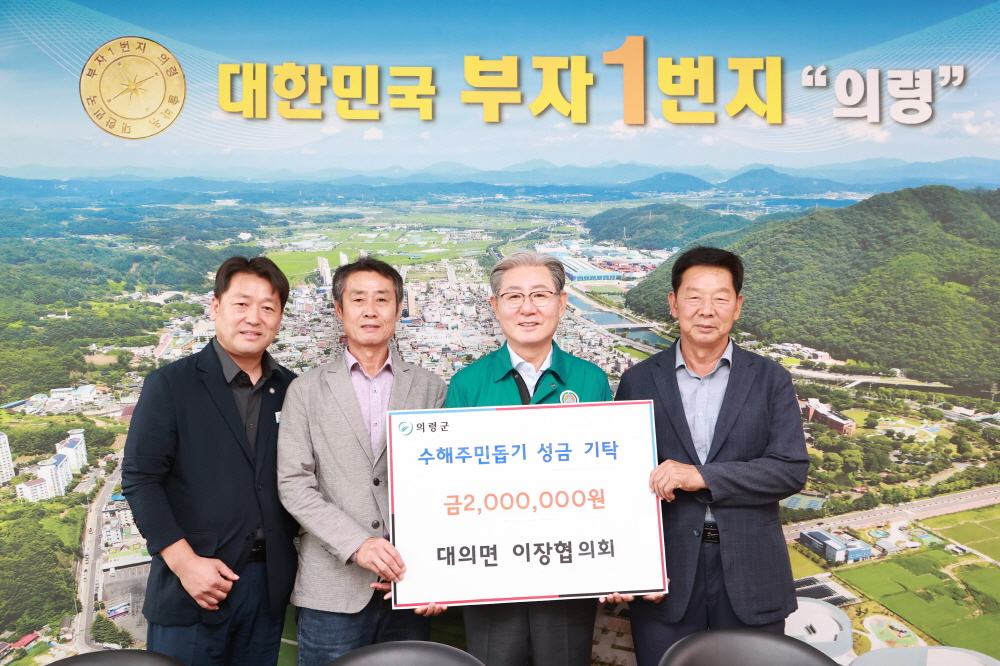 의령군에 수해 복구 성금 200만원 기탁 의령군은 대의면 이장협의회(단장 박수근)가 지난 7월 집중호우로 큰 피해를 입은 지역의 복구를 돕기 위해 수해 성금 200만원을 기탁했다고 24일 밝혔다. 이번 성금은 대의면 17개 마을 이장들이 한마음으로 뜻을 모아 마련한 것으로, 폭우와 침수 피해로 어려움을 겪고 있는 이웃 이재민들의 조속한 일상 회복과 복구 지원에 보탬이 되고자 하는 따뜻한 연대의 마음이 담겨 있다. 대의면은 이번 집중호우로 주택 침수와 도로 유실 등 적지 않은 피해를 입었지만, 마을을 대표하는 이장들이 자발적으로 성금을 모아 같은 지역의 어려운 이웃을 먼저 생각하는 모습은 지역사회에 큰 감동을 주고 있다. 특히 대의면 이장협의회는 지난 18일 의령군청을 방문해 성금 전달식을 갖고, 피해 주민들의 빠른 복구를 기원했다. 대의면 이장협의회는 평소에도 지역 현안 해결과 주민 화합을 위해 앞장서며, 행정과 주민 간 가교 역할을 충실히 수행해오고 있다. 이번 기탁은 마을 대표들이 고통을 함께 나누고자 한 마음으로 모은 정성이라는 점에서 더욱 뜻깊은 의미를 가진다. 군 관계자는 “같은 피해를 입은 상황에서도 이웃을 먼저 생각한 대의면 이장협의회의 따뜻한 마음에 깊이 감사드린다”며 “기탁된 성금은 피해 주민들의 복구와 생활 안정에 소중히 사용하겠다”고 말했다. 변경출 기자 사진...맨 오른쪽이 대의면 이장협의회 박수근 단장