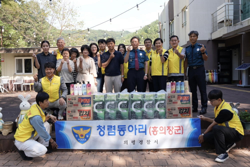 추석 맞아 청렴동아리 회원들과 함께 의령경찰서(서장 정욱용)는 추석을 맞이하여 청렴동아리 회원 10명과 함께 지정면에 소재한 ‘의령 사랑의 집’을 방문하여 위문금과 위문품을 전달했다고 1일 밝혔다. 이번 행사에서는 ‘의령 사랑의 집’을 직접 방문하여 위문금과 휴지 등 생필품을 전달하는 등 평소 소외 계층에 대한 관심과 나눔을 실천하고 희망과 용기를 주는 시간을 가졌다. 정욱용 경찰서장은 “민족 고유의 추석 명절을 맞아 이웃에게 필요한 물품을 전달할 수 있어 뜻깊 게 생각한다”며 “앞으로도 사랑 나눔 실천을 통해 군민에게 정성을 다하는 따뜻한 의령경찰이 되 도록 적극 노력하겠다.”고 말했다.