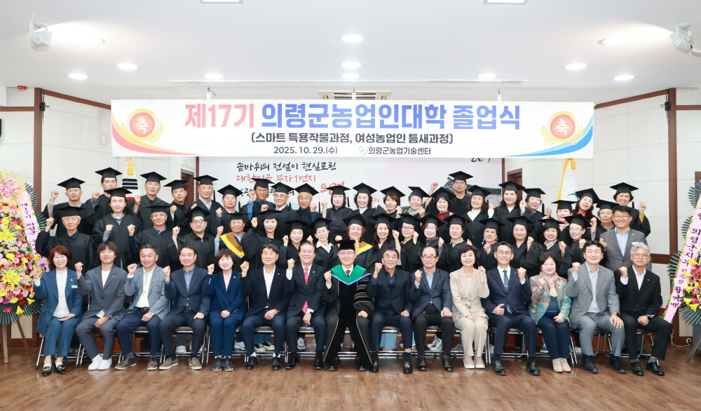 2개 과정에 총 52명 졸업생 배출 7개월간 100시간 학사 일정 마쳐 의령군은 지난달 29일 농업기술센터 3층 교육장에서 ‘제17기 의령군농업인대학 졸업식’을 개최했다고 1일 밝혔다. 이번 졸업식은 변화와 혁신을 선도할 전문 농업인력 양성을 목표로 추진된 교육과정의 결실을 맺는 자리였다. 올해로 제17회를 맞은 의령군농업인대학은 스마트 특용작물과정(24명), 여성농업인 틈새과정(28명) 등 2개 과정에서 총 52명의 졸업생을 배출했다. 지난 3월 25일 입학식을 시작으로 전공이론, 현장실습, 역량강화 교육 등을 포함해 약 7개월간 과정별 24회, 100시간의 학사 일정을 마쳤다. 이날 졸업식에서는 졸업생 전원에게 졸업증서가 수여됐으며, 김종갑 씨가 농촌진흥청장상을 받는 등 총 16명의 우수 졸업생이 수상의 영예를 안았다. 오태완 의령군농업인대학장은 “졸업생들이 배운 지식과 기술을 현장에 적극 활용해 의령농업의 지속가능한 발전을 이끌어주길 바란다”고 당부했다.