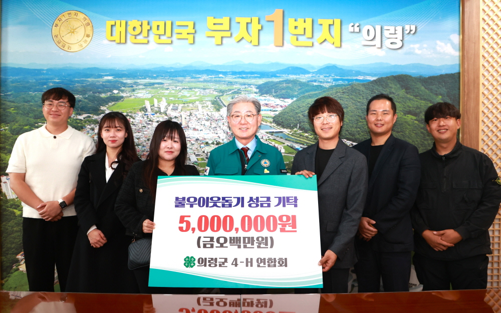 리치리치페스티벌 수익금과 회원들 성금 모아 의령군은 의령군4-H연합회(회장 박성재) 회원들이 의령군청을 방문해 불우이웃돕기 성금 500만원을 기탁했다고 7일 밝혔다. 이번 성금은 ‘제4회 의령리치리치페스티벌’에서 청년농업인들이 운영한 체험장 및 판매 부스 수익금과 회원들의 자발적 성금을 모아 마련됐다. 의령군4-H연합회는 지역 청년농업인들이 지(智)·덕(德)·노(勞)·체(體)의 4-H 이념을 바탕으로 함께 성장하며 지역사회 발전에 힘쓰는 단체다. 농업 기술 개발뿐 아니라 꾸준한 봉사와 나눔 활동으로 지역의 든든한 동반자가 되고 있다. 박성재 회장은 “축제를 통해 얻은 수익을 다시 지역사회에 환원할 수 있어 뜻깊다”며 “작은 정성이지만 어려운 이웃에게 힘이 되길 바란다”고 말했다. 오태완 군수는 “청년농업인들의 선한 영향력이 앞으로 의령의 미래를 밝히는 힘이 되길 기대한다”고 밝혔다. 변경출 기자 사진...성금 기탁 후 사진 촬영한 모습