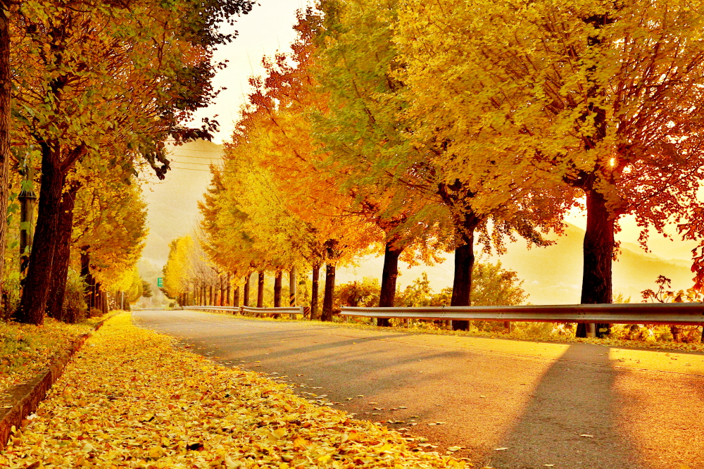 늦가을 정취가 내려앉은 의령군 칠곡면과 대의면의 경계인 대의고개=차량 통행이 줄어 한적한 도로를 따라 일렬로 늘어선 은행나무들이 황금빛 낙엽을 떨어뜨리며 계절의 깊이를 더하고 있다. 사진 제공...의령군청 홍보팀 제광모 주무관