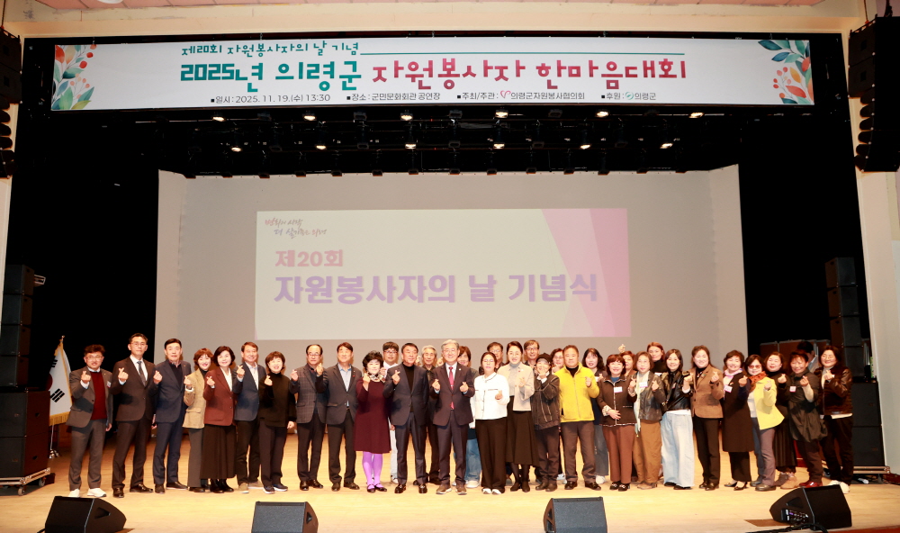 우수 자원봉사자 26명 표창 의령군은 의령군자원봉사협의회가 주최·주관하고 의령군이 후원한 ‘2025 자원봉사자 한마음대회’가 군민문화회관에서 관내 자원봉사자 등 300여 명이 참석한 가운데 열렸다고 20일 밝혔다. 자원봉사자 한마음대회는 지역사회를 위해 헌신해 온 자원봉사자들의 노고에 감사를 전하고, 자원봉사를 통해 하나 되는 공동체 정신을 나누는 화합의 장으로 마련됐다. 자원봉사자 간의 연대를 강화하고 활동의 의미를 되새기는 자리이기도 하다. 이날 행사에서는 무료급식, 환경정화, 재난지원 등 다양한 분야에서 꾸준히 봉사해 온 우수 자원봉사자 13명에게 군수 표창을, 다른 13명에게는 의령군자원봉사협의회장 표창을 수여했다. 성의정 의령군자원봉사협의회 회장은 “의령군 자원봉사자들의 헌신과 노고에 깊이 감사드리며, 자원봉사 문화가 지역사회 전반에 더욱 확산되도록 힘쓰겠다”고 말했다. 오태완 군수는 “보이지 않는 곳에서 지역을 위해 묵묵히 헌신하는 자원봉사자 여러분께 존경과 감사의 마음을 전한다”고 밝혔다. 사진...한마음대회 후 참석자들의 기념 촬영 모습