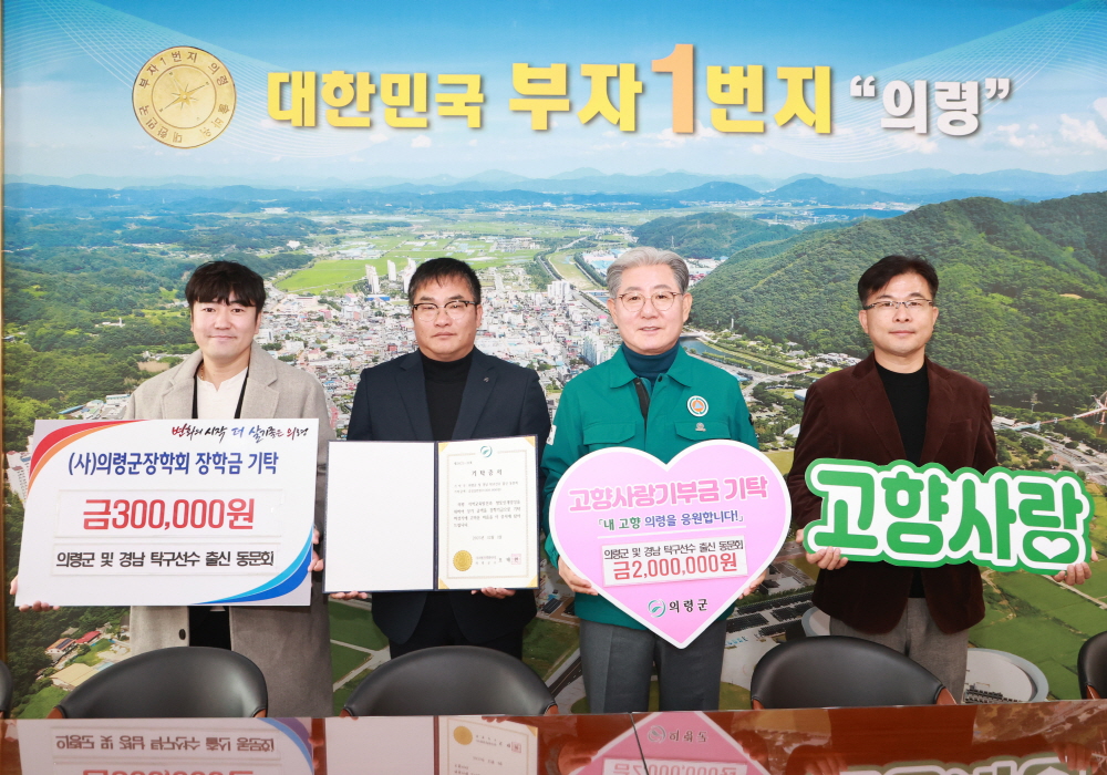 의령 출신 탁구 선수들 주축 단체 의령군은 지난 1일 의령군과 경남 지역 탁구선수 출신들로 구성된 동문회가 고향사랑기부금과 (사)의령군장학회 후원금으로 총 230만원을 기탁했다고 3일 밝혔다. 이 동문회는 의령 출신 탁구 선수들이 주축이 된 단체로, 전체 33명 회원 중 20명이 의령 출신이며 현역 국가대표 선수 4명도 활동하고 있다. 이번 기부는 고향을 향한 선수들의 애정에서 비롯된 것으로, 의령에 주소를 둔 회원들은 (사)의령군장학회에, 다른 지역 거주 회원들은 고향사랑기부제를 통해 각각 기부를 실천했다. 기탁식에는 동문회 회장인 의령남산초 탁구부 엄양석 지도자를 비롯해 의령군탁구협회 이석봉 회장, 이창준 전무이사가 참석했다. 동문회 관계자는 “탁구로 이어진 인연들이 마음을 모아 의령에 보탬이 될 수 있어 매우 뜻깊다”며 “앞으로도 지역 발전과 체육 인재 육성을 위해 꾸준히 힘을 보태겠다”고 말했다. 변경출 기자 사진...후원금 기탁 후 기념 촬영한 모습(왼쪽부터)이창준 전무이사, 엄양석 지도자, 오태완 군수, 이석봉 탁구협회 회장