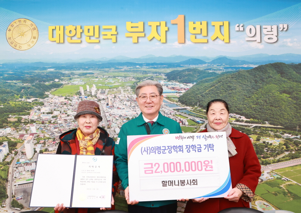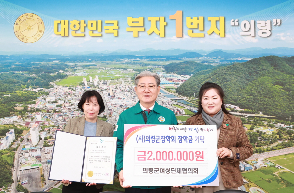 임원들,.. "앞으로도 지역 발전을 위한 나눔 이어갈 것" 의령군은 의령군여성단체협의회(회장 김순자)와 할머니봉사회(회장 곽차연)에서 지역 인재 육성을 위해 (사)의령군장학회에 장학금 각각 200만 원씩을 기탁했다고 11일 밝혔다. 의령군여성단체협의회는 비둘기회, 새마을부녀회, 생활개선회 등 10개 단체 975명으로 구성돼 있으며, 소속 단체인 할머니봉사회는 노인 봉사활동과 사회참여 확대를 위한 15명의 회원들이 활동하고 있다. 단체 임원들은 “의령의 미래를 이끌어갈 아이들의 꿈을 응원하고자 기탁을 결정했다”며 “앞으로도 지역 발전을 위한 나눔을 이어가겠다”고 말했다. 사진 1...의령군여성단체협의회 장학금 기탁 모습 사진 2...할머니봉사회 장학금 기탁 모습