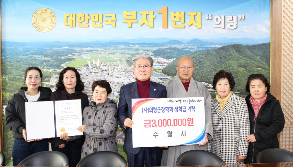 올해 상반기에도 300만원 기탁 의령군은 의령읍에 위치한 수월사에서 지역 교육 발전을 위해 (사)의령군장학회에 장학금 300만 원을 기탁했다고 12일 밝혔다. 수월사는 의병박물관과 남산둘레길, 의령구름다리 인근에 위치한 사찰로, 지역 주민과 방문객들이 꾸준히 찾고 있다. 올해 상반기에도 장학금 300만 원을 기탁한 데 이어 이번에도 추가 기탁을 이어가며 지역사회 인재 육성에 대한 지속적인 관심을 보여주고 있다. 수월사 주지스님은 “지역의 미래를 위해 교육 지원을 멈추지 않는 것이 중요하다고 생각한다”며 “앞으로도 지역사회와 함께 성장할 수 있도록 지속적인 나눔을 이어 가겠다”고 말했다.