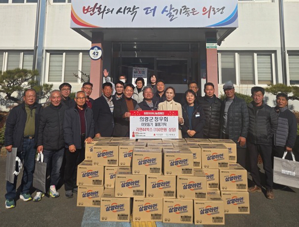 의령군 대의면은 사회단체 의령군청우회(회장 정종교)에서 대의면사무소를 방문해 라면 44박스를 기탁했다고 16일 밝혔다. 기탁된 라면은 가례·칠곡·대의면 등 관내 마을에 전달될 예정이다.