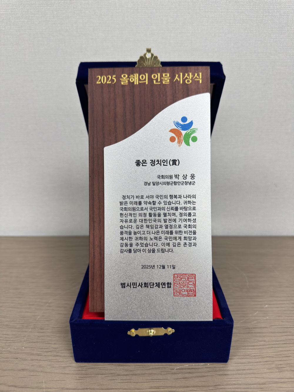 국회의 품격을 높인 신뢰의 정치, 지역과 국가를 잇는 균형 잡힌 의정활동 높이 평가 “국민과의 약속 최우선, 현장에서 답을 찾는 책임있는 의정활동으로 신뢰에 보답할 것 국민의힘 박상웅 국회의원(밀양·의령·함안·창녕, 원내부대표)이 지난 24일 범시민사회단체연합이 선정한 ‘2025 올해의 인물, 좋은 정치인상’을 수상했다고 31일 밝혔다. 박 의원은 국민과의 신뢰를 바탕으로 책임 있는 의정활동을 이어오며, 정책 전문성과 현장 중심의 문제 해결로 국회의 품격을 높이고 정의롭고 자유로운 대한민국의 발전에 기여한 점을 높이 평가받았다. 아울러 사실과 원칙에 기반한 의정활동을 통해, 시민사회가 요구하는 합리적이고 성숙한 정치의 방향을 실천해 왔다는 점도 이번 선정의 주요 배경으로 제시됐다. 특히 △국정 전반에 대한 합리적 견제와 대안 제시 △민생과 산업 현안을 아우르는 정책 활동 △지역과 국가를 잇는 균형 있는 시각의 의정활동이 이번 수상 배경으로 꼽혔다. 박 의원은 “이번 수상은 국민 눈높이에 맞는 정치가 무엇인지 다시 한 번 되새기게 하는 뜻깊은 평가”라며 “앞으로도 국민과의 약속을 최우선에 두고, 현장에서 답을 찾는 책임 있는 의정활동으로 신뢰에 보답 하겠다”고 밝혔다. 한편, 범시민사회단체연합은 교육‧환경‧정치‧행정‧문화 등 12개 분야에 350여개 시민단체가 연합해 활동하는 단체이다. 사진...좋은정치인상 상패 모습