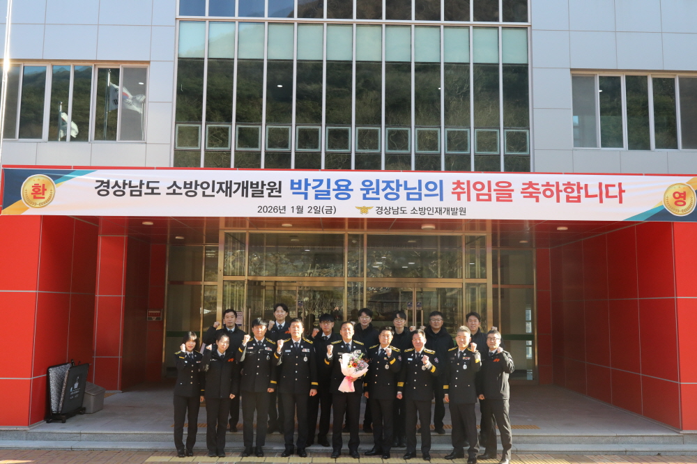 “현장에 강한 소방, 도민이 안심하는 안전한 경남을 만들겠다” 경상남도 소방본부(본부장 이동원)는 2026년 1월 2일 자로 신설 기관인 경상남도 소방인재개발원의 초대 원장에 박길용 소방정을 임명했다고 밝혔다. 경상남도 마산 출신인 박 원장은 2007년 소방간부 후보생 14기로 공직에 입문한 이후 소방본부 예방안전과 전담교관팀장, 김해서부소방서 현장대응단장, 합천소방서 예방안전과장, 소방본부 방호구조과 사법(화재)조사담당, 구조담당 등 주요 보직을 두루 역임하며 풍부한 현장 경험과 뛰어난 리더십을 인정받아 왔다. 특히 재난 대응, 구조, 안전 교육 분야에서 높은 전문성을 바탕으로, 소방 안전 강화와 교육의 중요성을 지속적으로 강조해 왔으며, 각종 재난 상황에서 신속하고 효과적인 대응 체계 확립에 기여해 왔다. 박 원장은 취임사에서 “‘1=기본에 충실하자’와 ‘2=원팀이 되자’를 경상남도 소방인재개발원의 가장 중요한 원칙으로 삼겠다”고 밝혔다. 또 “철저한 기본기와 원칙에 기반한 교육훈련을 통해 현장 대응 역량을 강화하고, 소방본부·일선 소방서·유관기관이 하나의 팀이 되어 재난으로부터 가장 안전한 경남을 만드는 데 최선을 다하겠다”고 말했다. 박 원장은 이어 “경상남도 소방인재개발원이 ‘현장에 강한 소방, 도민이 안심하는 안전한 경남’을 실현하는 중심 교육기관으로 자리매김할 수 있도록 직원들과 함께 책임감을 갖고 역할을 다하겠다”고 강조했다. 사진...박길용 원장의 취임식 후 직원들과 기념 촬영한 모습