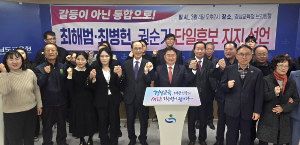 단일화 약속 지켜 힘 모을 것 최병헌 전 경남교육청 학교정책국장과 최해범 전 창원대학교 총장이 보수·중도 경남교육감 후보 단일화 연대의 권순기 단일 후보 지지를 선언했다. 이어 "이념이 아닌 실력으로, 진영이 아닌 경남 교육의 미래로 판단할 수 있는 인물"이라며 "오늘 우리의 선언은 한 사람의 선택이 아니라 단일화 정신을 지키는 결단이며 도민과의 약속을 실천하는 행동"이라고 강조했다. 사진...기자회견장 모습
