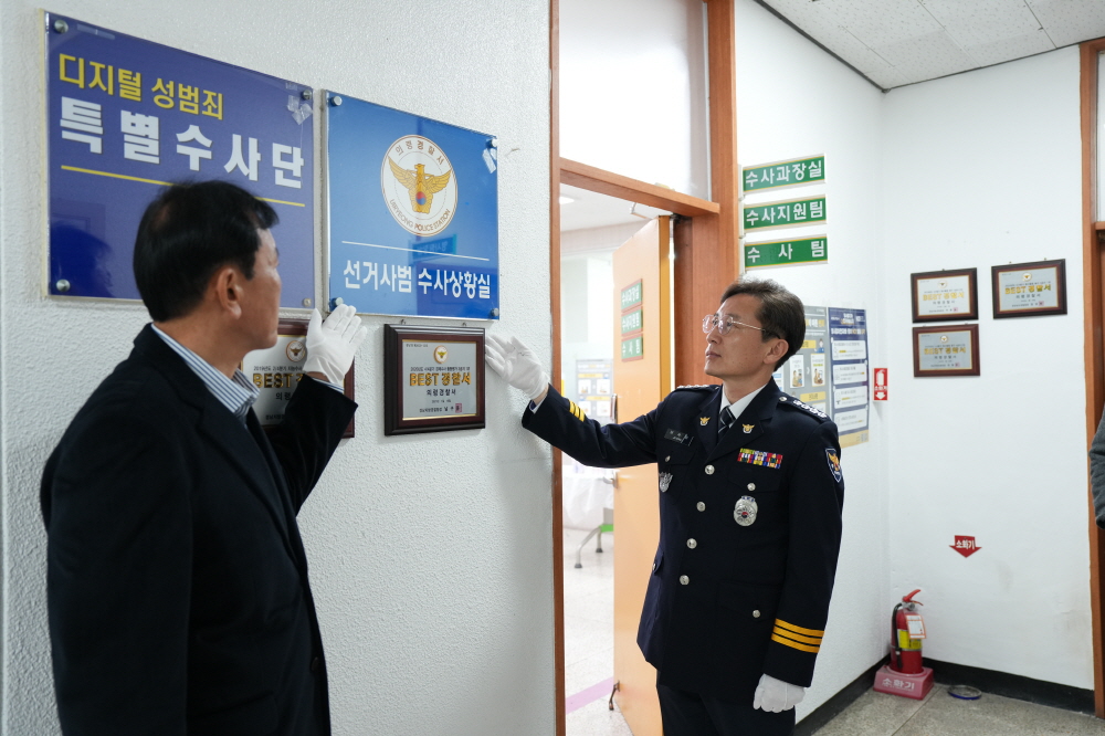 85일 동안 24시간 불법선거운동 중점 단속 의령경찰서(서장 정욱용)는 18일 경찰서 1층 수사과 사무실 앞에서 정욱용 서장을 비롯하여 수사과 팀장 등이 참석한 가운데 선거사범 수사상황실 현판식을 가졌다. 6월 3일 제9회 전국동시지방선거를 앞두고 전국적으로 실시된 현판식은 경찰의 정치적 중립과 공명선거 확립을 통해 이번 선거가 가장 공정한 선거로 평가 받을 수 있도록 최선을 다하겠다는 의지를 담고 있다. 경찰은 이를 위해 3월 18일부터 선거 종료 후인 6월 10일까지 85일 동안 24시간 선거관련 첩보수집과 단속을 위한 선거상황반을 편성해 운영하면서 금품제공, 후보비방, 허위사실유포 등 흑색선전과 공무원 선거개입, 사이버 공간에서 불법 선거운동 등을 중점적으로 단속한다. 정욱용 경찰서장은 “올바른 선거문화 정착을 위해 불법 선거사범에 대해 엄정히 대처해 나갈 것”이라고 강조했다. 변경출 기자 사진...선거사범 수사상황실 현판식 모습(오른쪽이 정욱용 경찰서장)